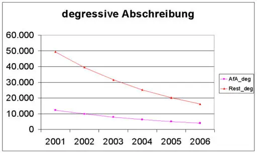 Hier erfolgt die Abschreibung in fallenden Abschreibungsbeträgen. Die höchsten Abschreibungen hat man in den ersten Jahren, dann werden sie immer geringer. Im letzten Jahr wird der Rest abgeschrieben. Es gab früher auch Regelungen, wo ein Wechsel von der degressiven zur linearen AfA möglich war.