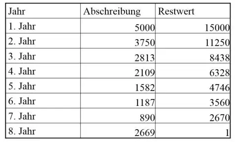 Beispiel: Eine Maschine mit einer Nutzungsdauer von 8 Jahren und Anschaffungskosten von 20.000 € soll degressiv abgeschrieben werden. Der berechnete Abschreibungsprozentsatz beträgt 25 %.