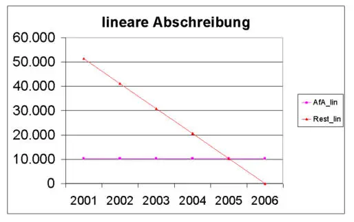 Hier erfolgt eine gleichmäßige Verteilung der Abschreibungsbeträge auf die Nutzungsdauer.