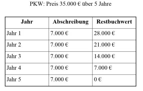 Die lila Linie, welche gerade auf der 10.000 verläuft, stellt die jährliche Abschreibung dar. Da diese jedes Jahr gleich ist, ergibt sich eine waagerechte Linie. Die rote Linie stellt den Restbuchwert dar. Dieser fällt gleichmäßig und erreicht im letzten Jahr die Null. Hier ein Beispiel für die Abschreibung eines PKW über fünf Jahre. Die Anschaffungskosten betrugen 35.000 €. Die Abschreibungsdauer soll 5 Jahre betragen. Damit ergibt sich eine Abschreibung pro Jahr von: 35.000/5=7.000 €