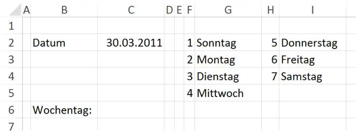 Im Feld C2 soll ein beliebiges Datum eingegeben werden. Im Feld C6 soll zu dem Datum der entsprechende Wochentag ausgegeben werden. In der Zelle C4 soll über die Funktion =WOCHENTAG() der Wochentag als Zahl, per Zwischenschritt ermittelt werden. Diese Funktion gibt die Zahlen 1 bis 7 für den Wochentag wieder. Die Zuordnung ist wie folgt: