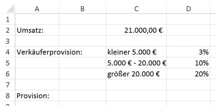 Es soll die Provision für einen Verkäufer berechnet werden. Dazu gibt es eine Provisonsstaffel mit drei möglichen Werten. Ist der Umsatz kleiner als 5.000 €, dann gibt es 3 % Provision vom Umsatz, liegt der Umsatz zwischen 5.000 € und 20.000 € (inklusive 5.000 und 20.000 EUR), dann gibt es 10 % Provision vom Umsatz und wenn der Umsatz über 20.000 € liegt, dann gibt es sogar 20 % Provision. In Feld C2 soll der Umsatz eingegeben und in Feld C8 soll die entsprechende Provision in Euro ausgegeben werden.