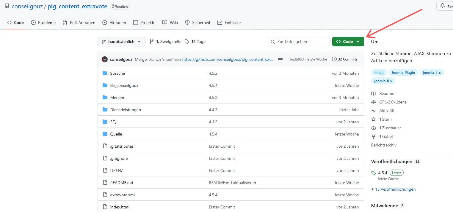 Dazu in GitHub rechts oben auf das grüne Feld Code-klicken und dann als ZIP-Datei (plg_content_extravote-main) herunterladen.