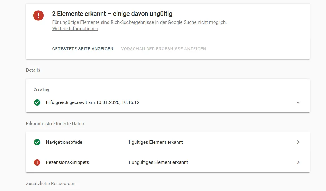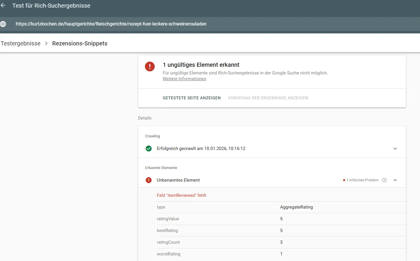 Google möchte genau wissen, was bewertet wird. Wenn die Sterne einfach nur im Text erscheinen, fehlt der Bezug zum Artikelnamen. Google findet zwar eine Bewertung (AggregateRating), weiß aber nicht, ob diese zu einem Produkt, einem Buch oder einem Blogbeitrag gehört. Das Ergebnis ist die Fehlermeldung in der Search Console.